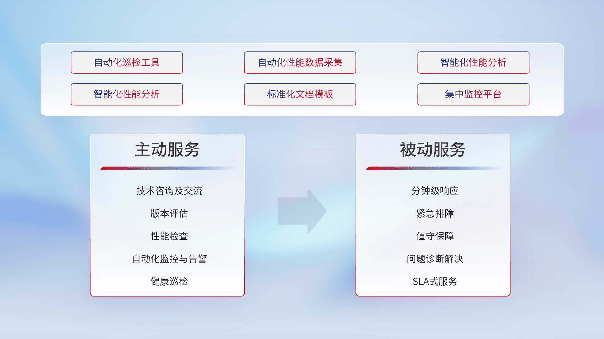 智能化工具和标准化文档,,保障服务质量,,,,提供主动服务(包含技术咨询、、版本评估、、、性能检查、、、、自动化监控与告警、、、、健康巡检)和被动服务包含(分钟级响应、、、紧急排障、、、、值守保障、、、、问题诊断解决、、、、SLA服务)。。。
